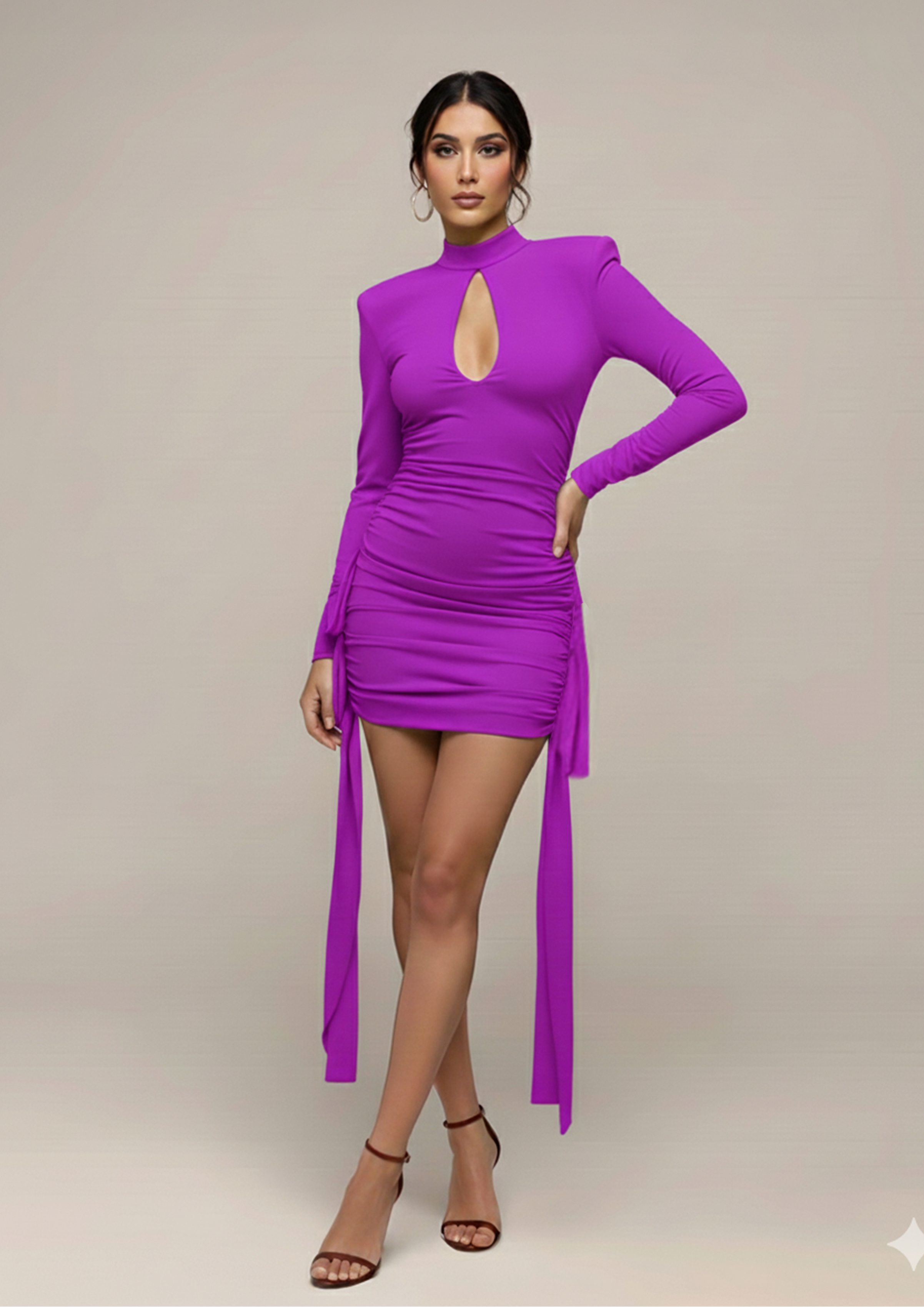 Abito corto con scollo a goccia e collo alto, gonna arricciata con fascioni rouches laterali.