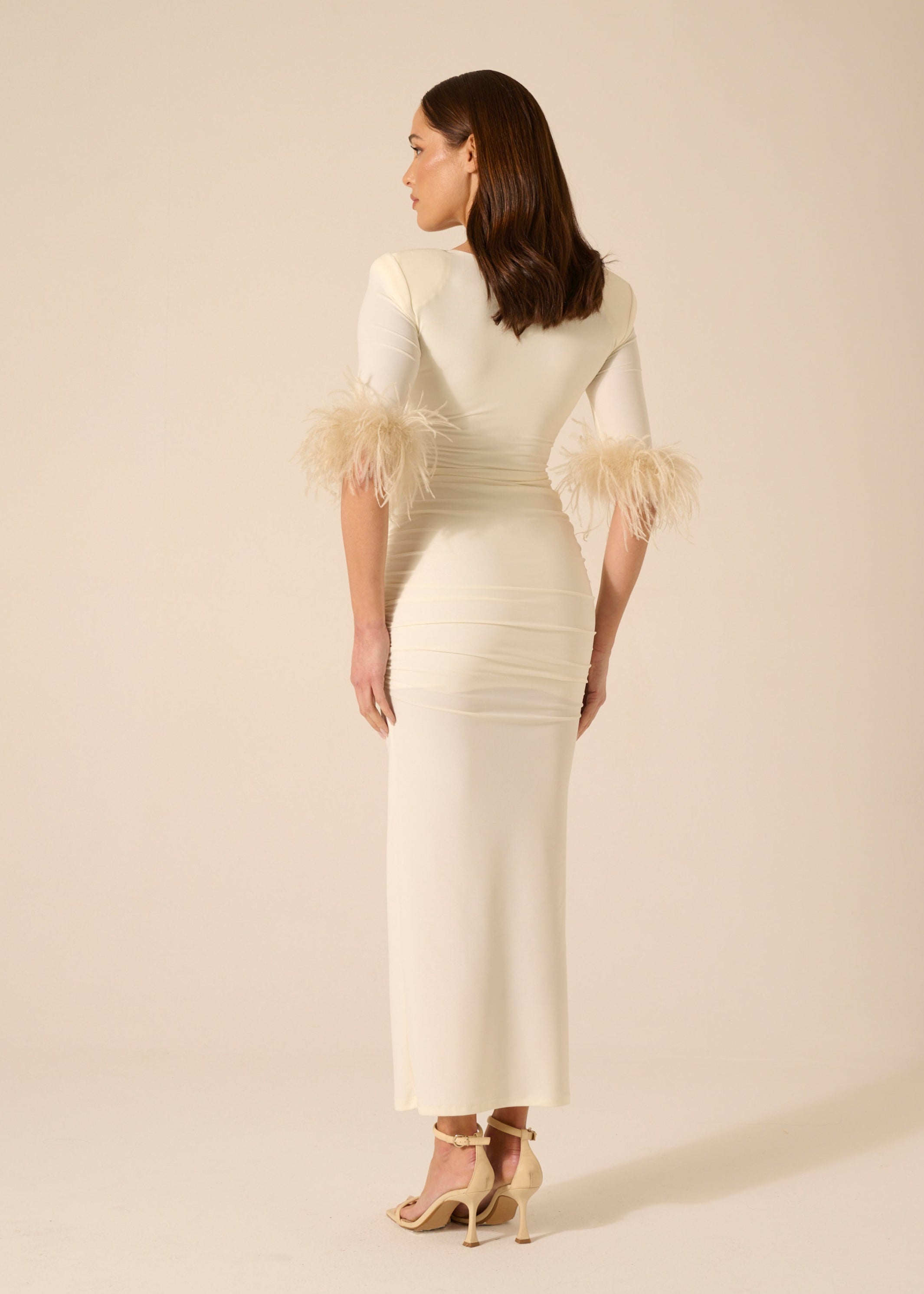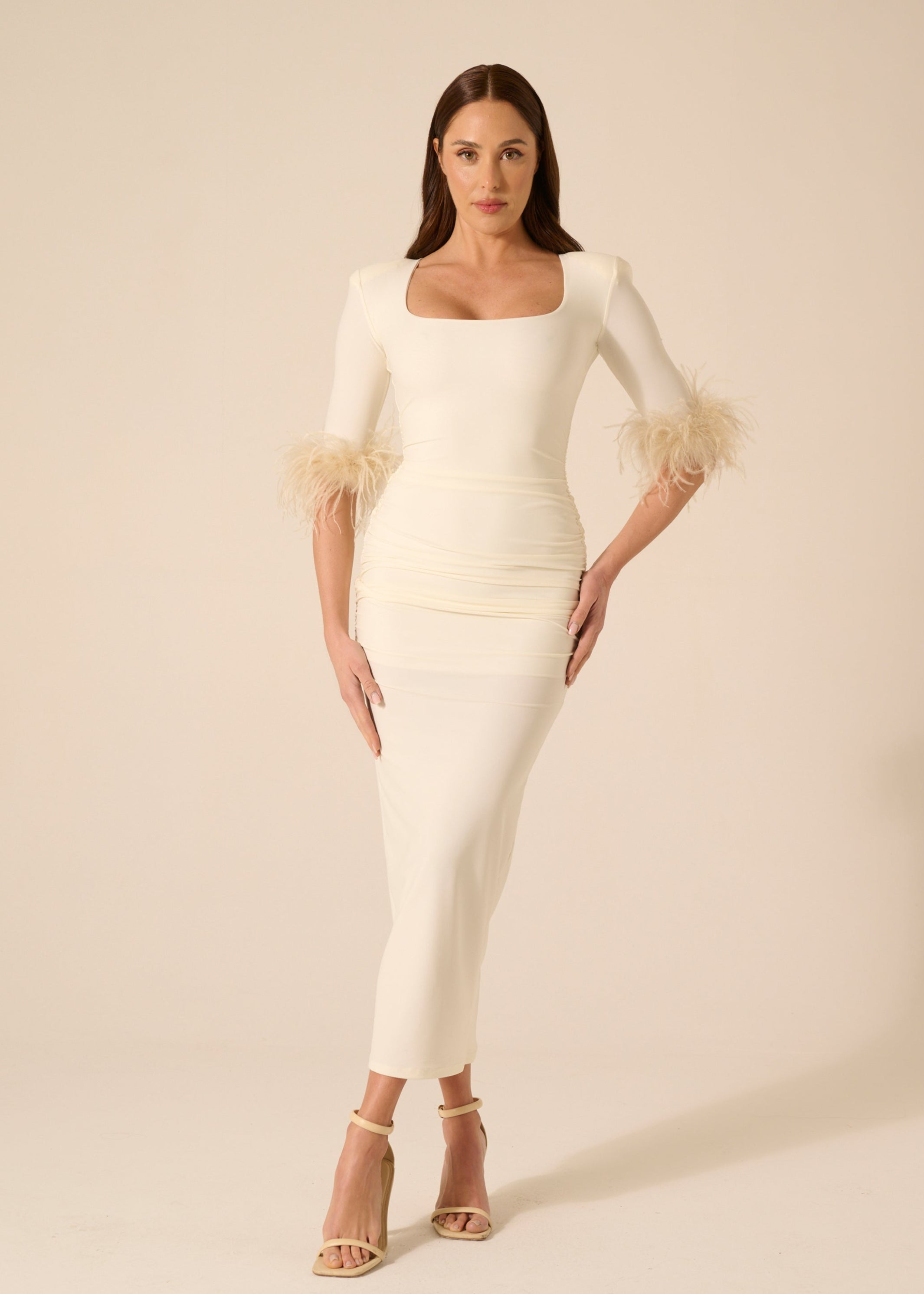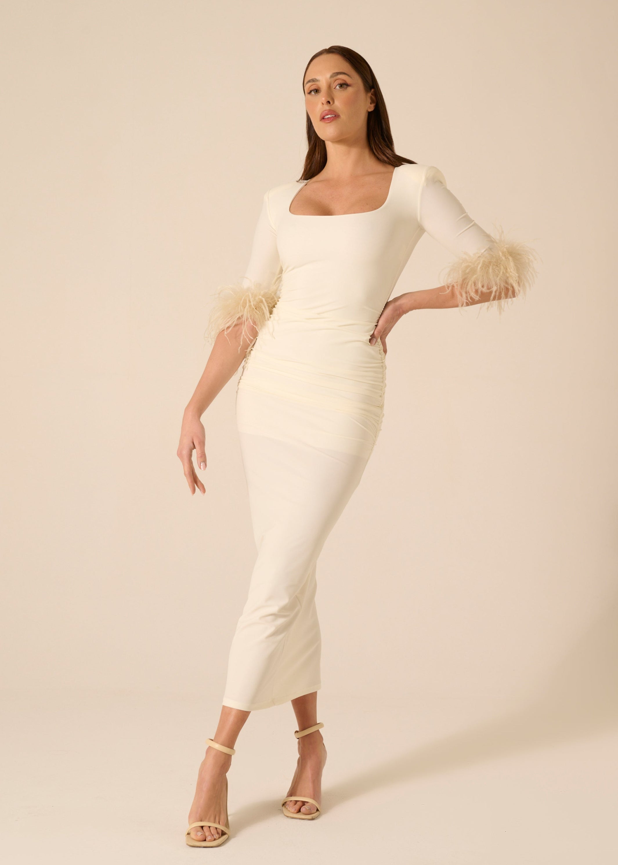 Longuette dress with square balconette neckline, half sleeve, gathered length with ostrich and marabou feather appliqué, fixed. Lined.