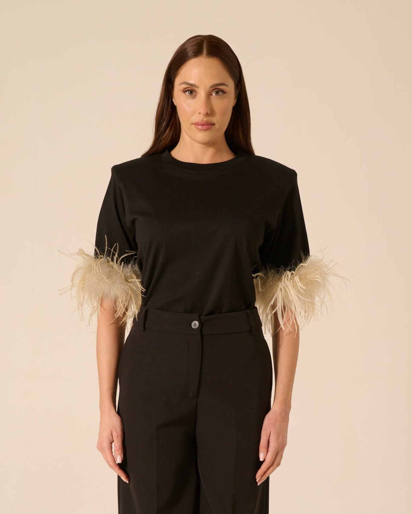 Skirt with adjustable drapes, t-shirt with pronounced shoulder strap.