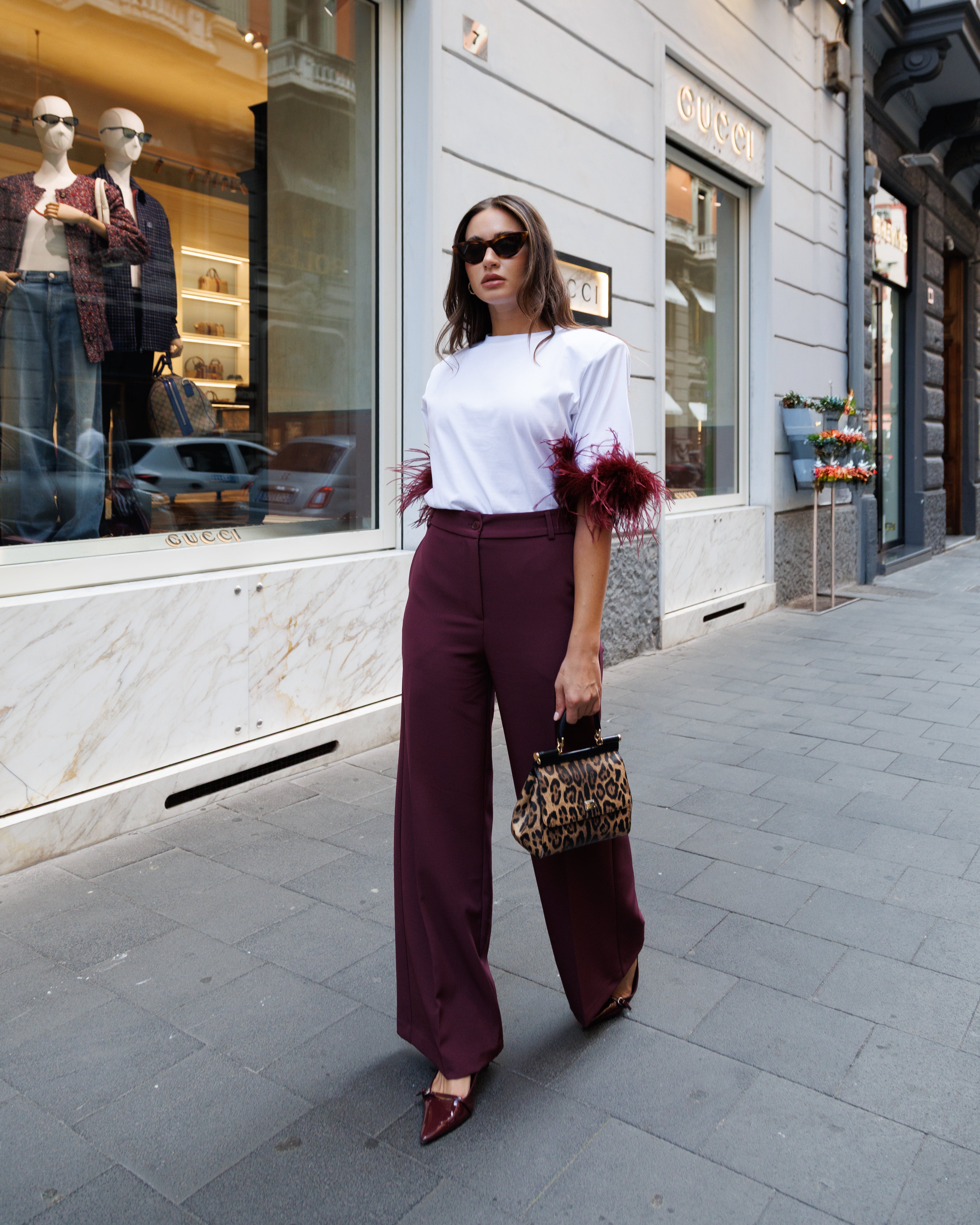 La t-shirt è in taglia unica e presenta le spalline imbottite e piume in struzzo e marabù rimovibili.